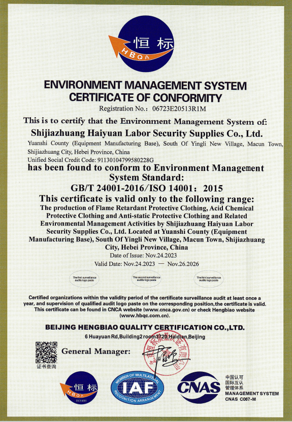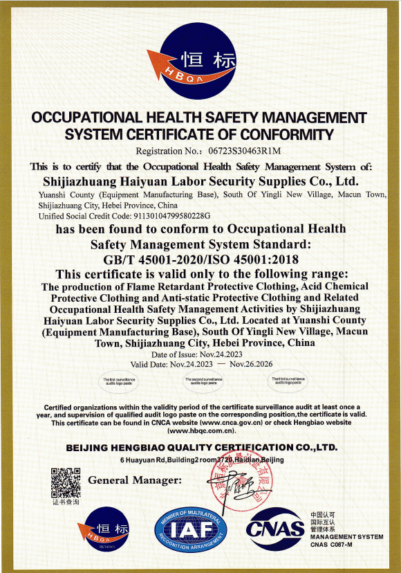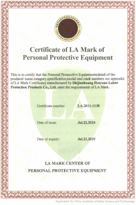 Over the years, our company has successively passed ISO 9001:2015 and other three system certifications, LA labor safety certification, TUV Rheinland international certification, and CE certification. We are an innovative production enterprise with complete qualifications and standardized production. Our team is young, production is intelligent, and management is refined. Shijiazhuang Haiyuan Labor Protection Products Co., Ltd. will never forget its original intention, continue to work hard, cooperate for mutual benefit, and create brilliance. Haiyuan is willing to work with you, unite and write a new chapter in the new era together!